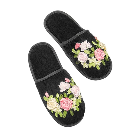 Appliquéd with elegant pink and white ribbon roses, these slippers are simply beautiful. They’re soft in black velvet with a lightly padded bottom. Imported. S(5-6), M(7-8), L(9-10), XL(11-12).