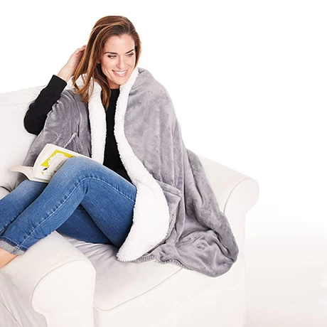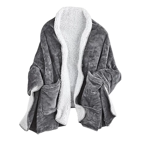 Wrap yourself in it like a cardigan or curl up under it like a blanket. This extra-soft wearable throw is smooth on one side, fleecy on the other and cuddly all over. Perfect for women or men, this polyester fleece throw has two large pockets. Machine wash. Imported. 72″ long, 32″ wide.