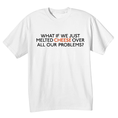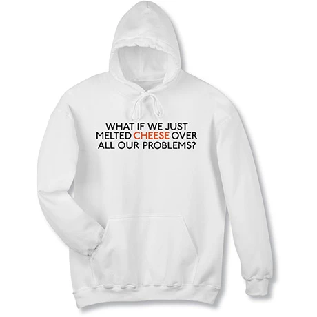 It’s a fact: Few things work as wonderfully to make our problems more palatableĀ asĀ an ooey, gooey covering of melted cheese. White sweatshirts are 50/50 cotton blend, T-shirt is preshrunk 100% cotton. Machine wash. Imported. S-3XL.