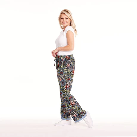 Choose one, two, or all three, each as elegant as the next. All are timeless prints by Arts and Crafts master William Morris (1834-96). Pants have wide legs, sideseam pockets, and an elastic drawstring waist with ties that end in wooden beads. The hems are embellished with cotton lace. 100% rayon. Sizes S(6-8), M(10- 12), L(14-16), XL(16-18), 1X(18-20), 2X(20-22). Size M inseam 31″. Hand wash. Imported.