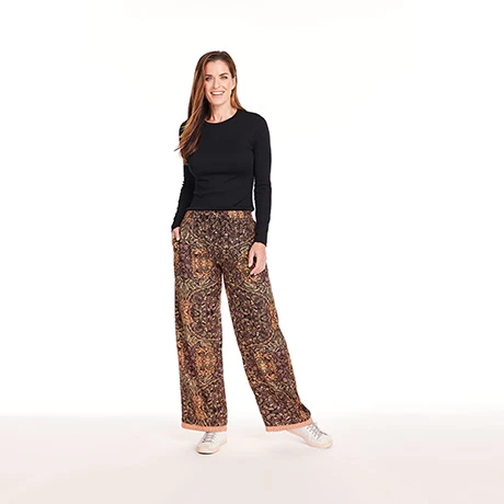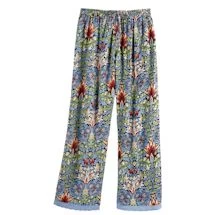 Choose one, two, or all three, each as elegant as the next. All are timeless prints by Arts and Crafts master William Morris (1834-96). Pants have wide legs, sideseam pockets, and an elastic drawstring waist with ties that end in wooden beads. The hems are embellished with cotton lace. 100% rayon. Sizes S(6-8), M(10- 12), L(14-16), XL(16-18), 1X(18-20), 2X(20-22). Size M inseam 31″. Hand wash. Imported.