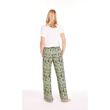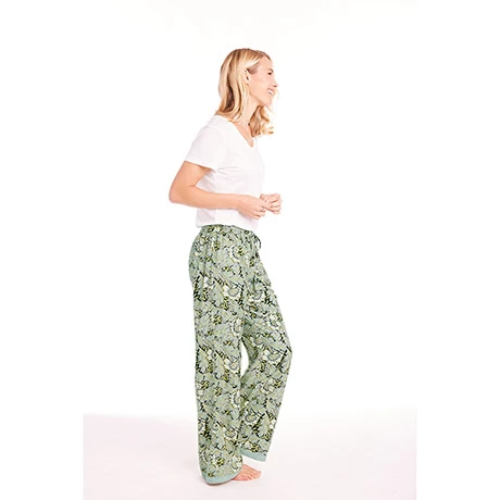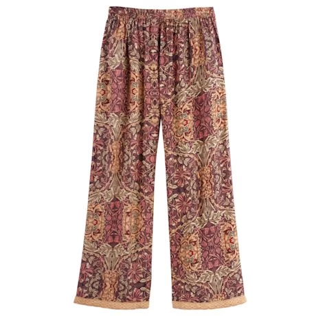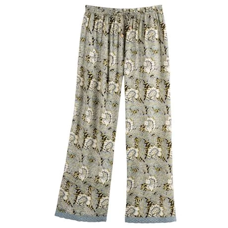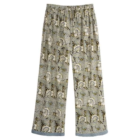 Choose one, two, or all three, each as elegant as the next. All are timeless prints by Arts and Crafts master William Morris (1834-96). Pants have wide legs, sideseam pockets, and an elastic drawstring waist with ties that end in wooden beads. The hems are embellished with cotton lace. 100% rayon. Hand wash. Imported. Sizes S(6-8), M(10- 12), L(14-16), XL(16-18), 1X(18-20), 2X(20-22). Size M inseam 31″. Specify Blue, Red or Sage.