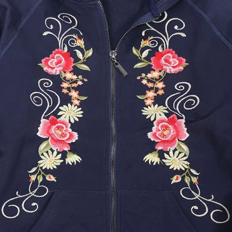 Our embroidered hoodies for women feature three stunning floral designs in three classic hoodie colors: choose Black, navy blue, or gray to suit your style.