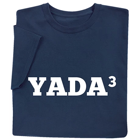 Yada to the third power = Yada Yada Yada. A mathematical abbreviation to keep the story moving along. Navy sweatshirt is cotton/poly. T-shirt is preshrunk 100% cotton. Machine wash. Imported. S-3X.