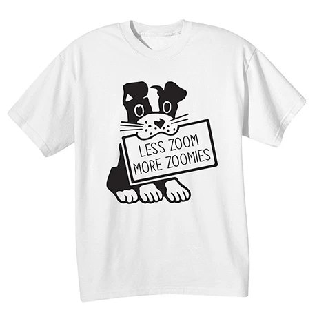 A sweet dog with a friendly message for anyone working from home: Get your priorities straight! White sweatshirt is 50/50 cotton blend, T-shirt is preshrunk 100% cotton. Sizes S-3XL. Imported.